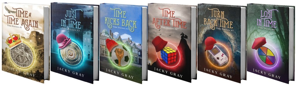 I managed to squeeze books 1 and 2 in before the end of 2022 – which was a tough target, as I didn’t start Just in Time until November, but thanks to NaNoWriMo, I wrote it in a month. Two years later, I pubbed the sixth book, and here are the glorious covers. Didn’t they do well?
