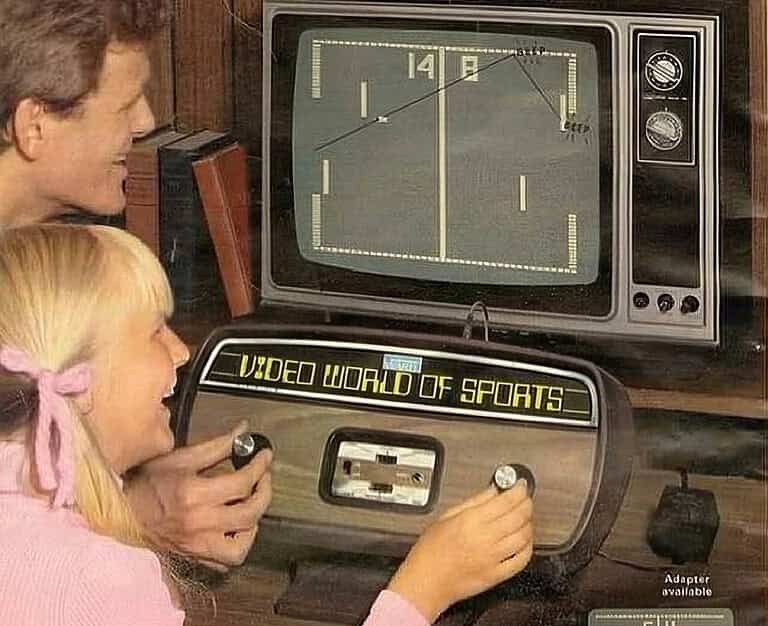 1975 – Pong: a two-dimensional sports game that simulates table tennis. Two opposing players control paddles by moving them vertically across the left or right side of the screen to hit a ball back and forth until one misses and scores a point. The goal is for each player to reach eleven points before the opponent.