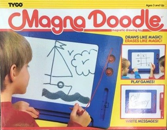 1976 – Magna Doodle: This toy uses a magnetophoretic display panel, filled with a thick, opaque white liquid containing tiny dark magnetic particles. These particles can be drawn to the drawing surface by a magnet-tipped stylus.