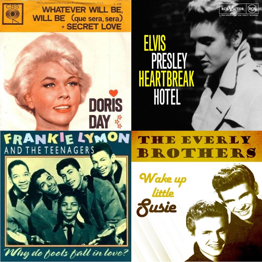 1. Doris Day – Whatever Will Be Will Be (Que Sera Sera) – 07-56 – Columbia 2. Elvis Presley – Heartbreak Hotel – 03-56 –RCA 3. Frankie Lymon & The Teenagers – Why Do Fools Fall In Love – 02-56 – Gee 4. The Everly Brothers – Wake Up Little Susie – 10-57 – Cadence 5. Mickey & Sylvia – Love Is Strange – 02-57 – Groove 6. Bing Crosby & Grace Kelly – True Love – 10-56 – Capitol 7. Vic Damone – On The Street Where You Live – 06-56 – Columbia 8. Jimmie Rodgers – Kisses Sweeter Than Wine – 12-57 – Roulette 9. Johnny Mathis – The Twelfth Of Never/Chances Are – 09-57 – Columbia 10. Fats Domino – Blueberry Hill – 10-56 – Imperial 11. Carl Perkins – Blue Suede Shoes – 03-56 – Sun 12. Buddy Holly – Peggy Sue – 12-57 – Coral 13. Johnny Cash – I Walk The Line – 11-56 – Sun